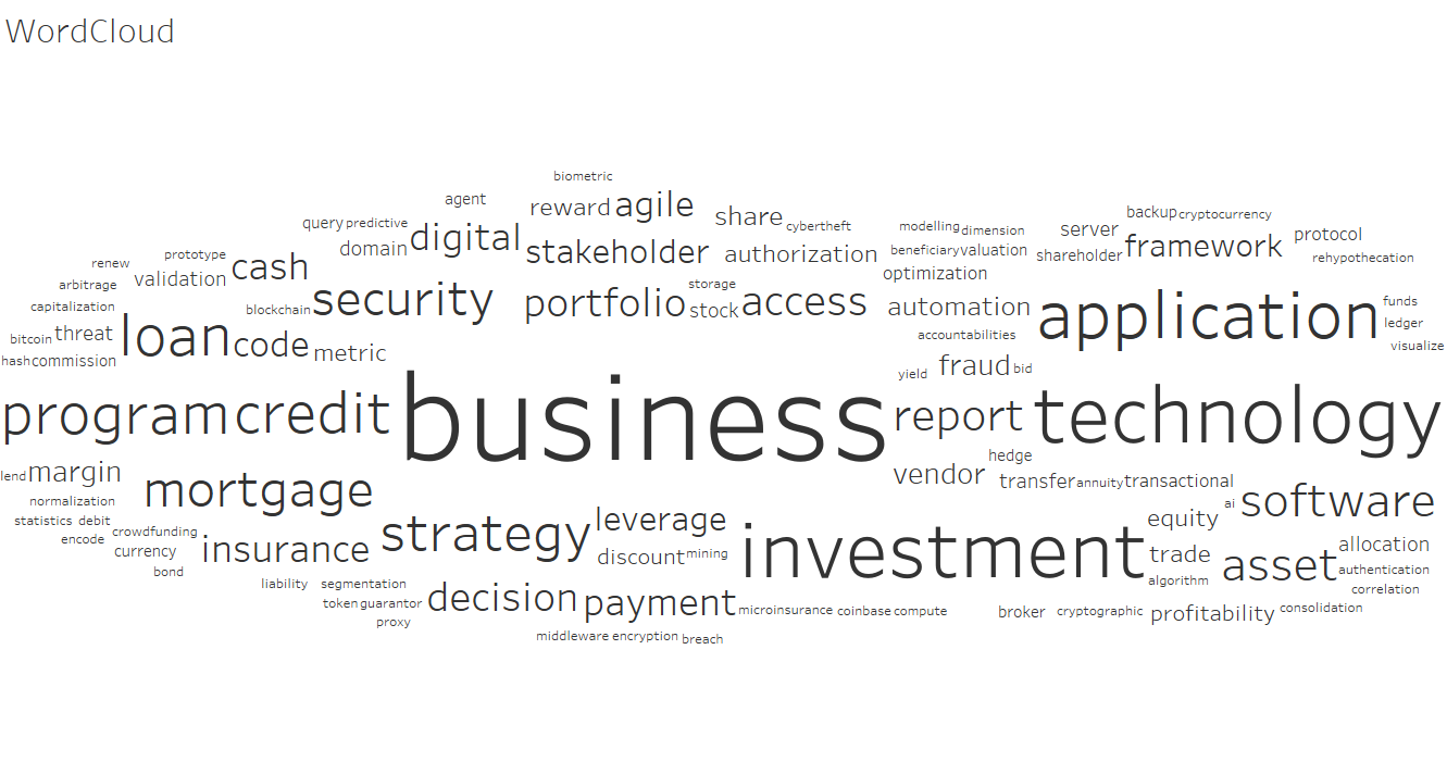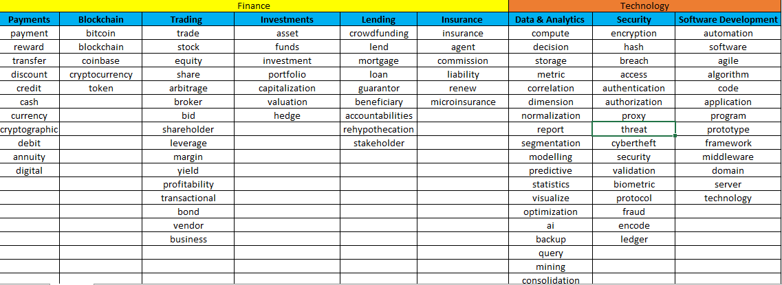 The ranked top 104 words were then clustered in 9 different buckets based on their relevance.We considered 9 buckets ie Payments, Blockchain, Trading, Investment, Lending,Insurance , Data & Analytics, Security and Software Development. Then we further divided these buckets into two buckets ,Financial and Technology. The words related to the financial domain were classified under the finance domain and the words related to the technical domain were classified under the technology domain.