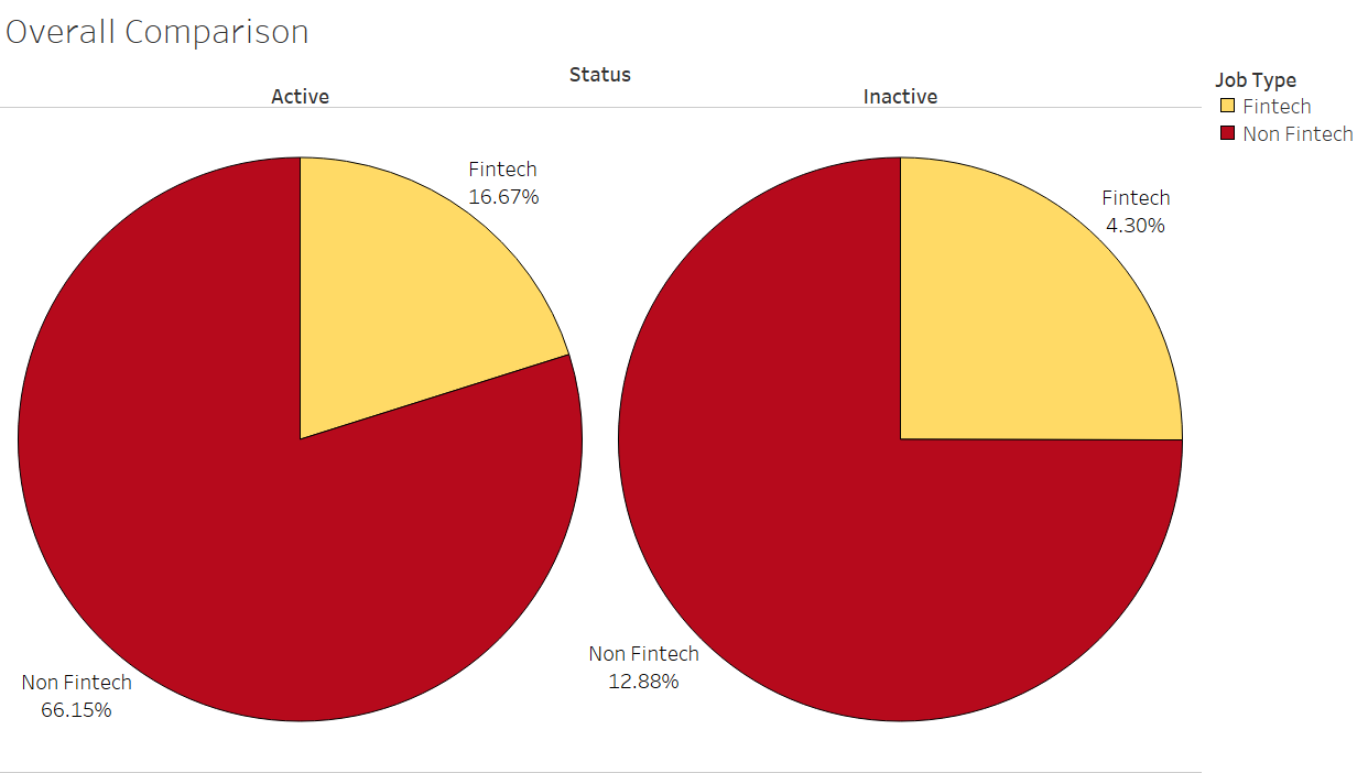 Using both the filters that is whether a link is active or not and that whether the jobs are fintech or not we plotted the overall comparison. We concluded that the weightage of active non fintech jobs is greater than the active fintech jobs by a significant amount and the same conclusion was made that the inactive non fintech job was greater than inactive fintech jobs.