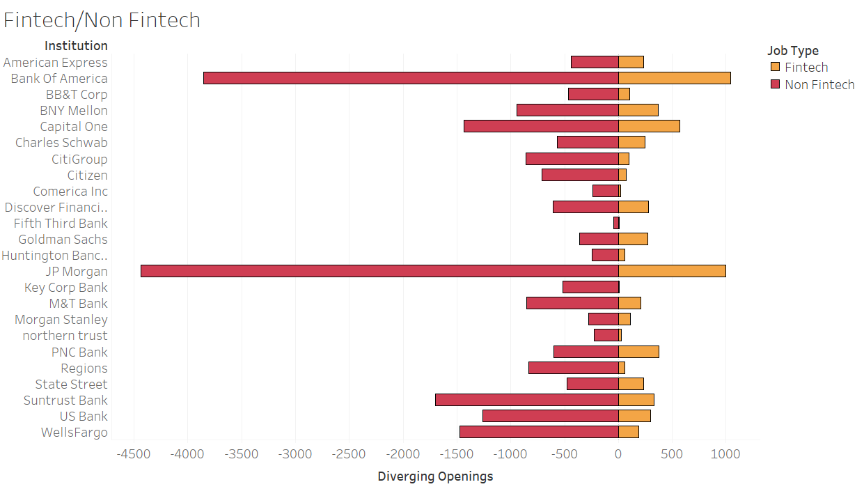 We segregated the data firstly on the basis of the link status that is whether the links are active or not. Then we used the filter of location that is whether a job location is in USA or not. Then we plotted the graph between the axes : the name of the banks and the count of the fintech jobs and non fintech jobs in those banks.We concluded that the number of job openings in both Fintech and non Fintech are the highest in JP Morgan followed by Bank Of America where as Fifth Third bank has the least number of openings in both the sectors.