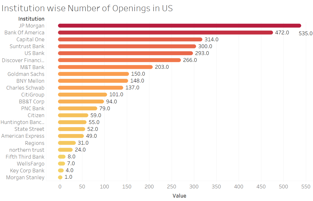 As of February 2019, JP Morgan had the largest job opening with estimated count of around 535 followed by Bank Of America (472) and Capital One(314).