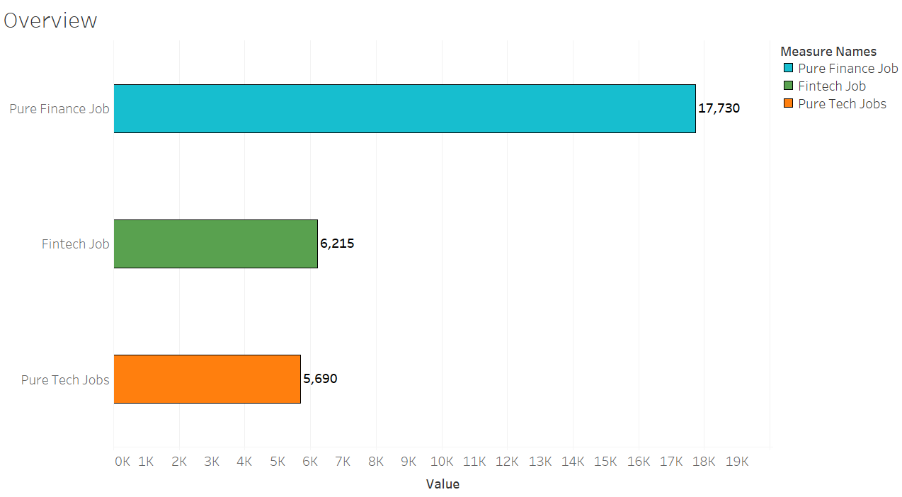 Below bar chart helps us to conclude that the number of pure fintech jobs is slightly greater than the pure technology jobs where as the finance jobs outweigh both by a very large number.